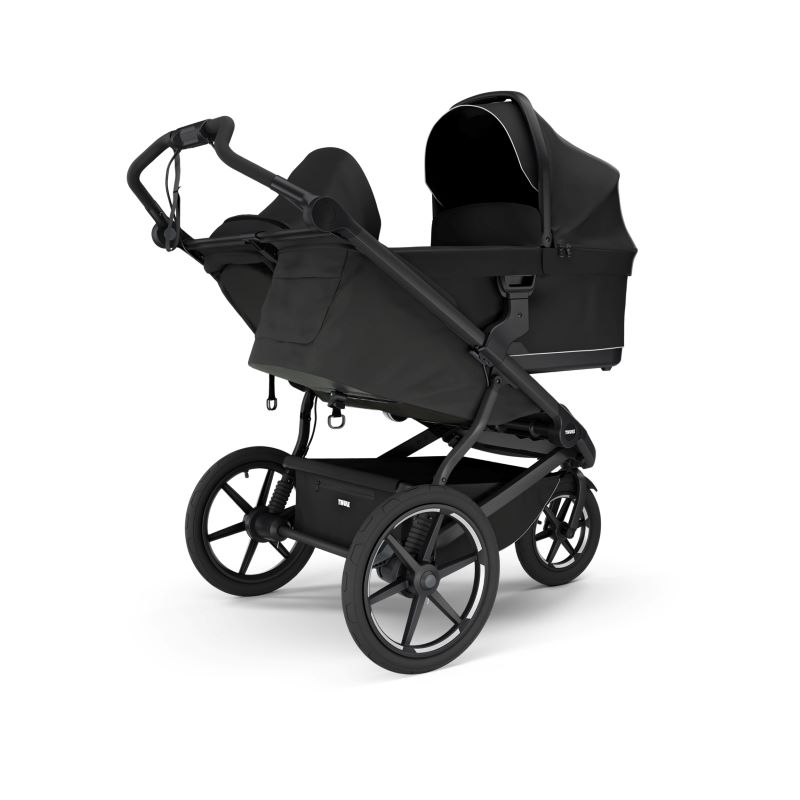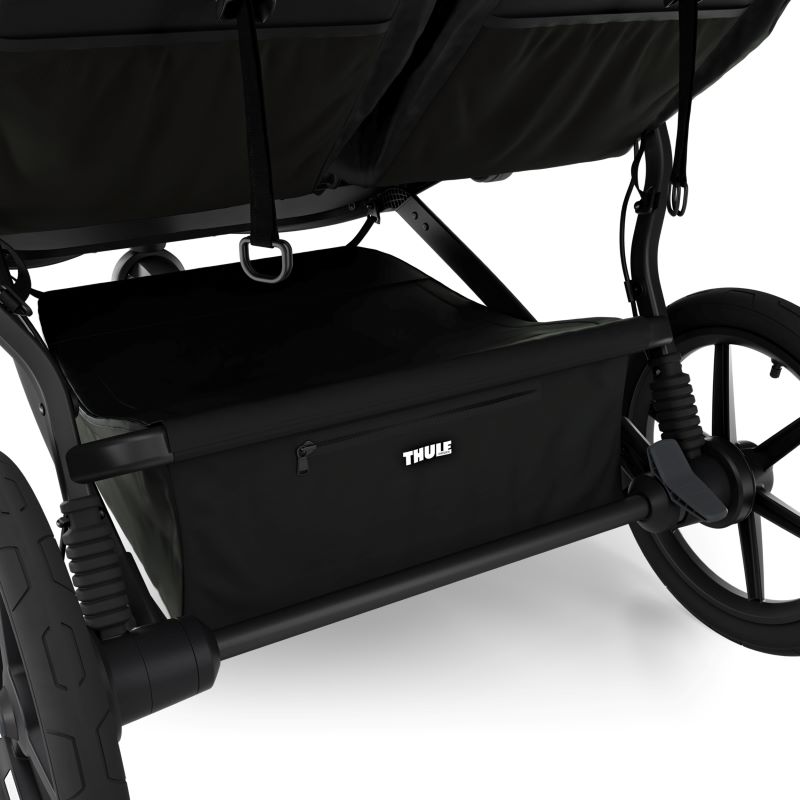 Papildu funkcijas: Ratiņi ir aprīkoti ar rokas bremzi drošai ātruma kontrolei, plašu kravas grozu ar rāvējslēdzēju, kā arī papildu kabatām uzkodām vai rotaļlietām. Atstarojošie elementi uz jumta un riteņiem uzlabo redzamību un drošību.