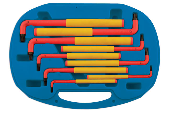 Īpaši garš izolētu atslēgu komplekts T10 līdz T50, ar VDE sertificētu aizsardzību atbilstoši IEC60900 standartam, darbam līdz 1000V AC vai 1500V DC.